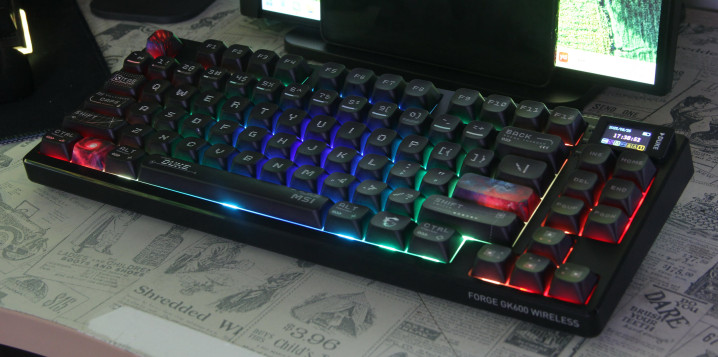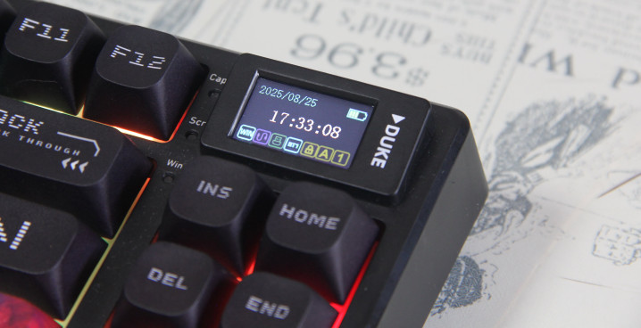 键盘的TFT小屏幕是其最大亮点之一,虽然仅占据两个键位大小,但显示效果清晰细腻。这块小屏可实时显示日期、时间、电量、系统状态以及连接模式等信息,免去了传统指示灯的繁琐,同时也为键盘增添了独特的科技感和个性辨识度。通过专属驱动还可以定制个性化的动画LOGO,让这块小屏成为专属展示窗口,大大提升了产品的辨识度和科技感。在开机时,微星标志性的龙盾Logo会如全息投影般缓缓浮现,随后切换成精致的时间显示,这种设计不仅体现了微星的品牌特色,还为用户提供了个性化的视觉体验。