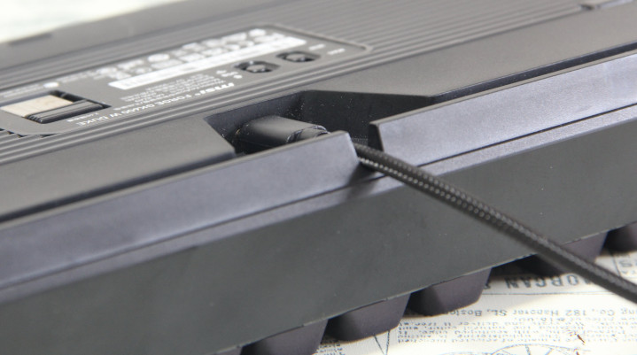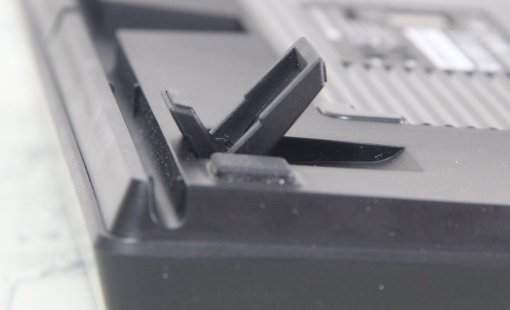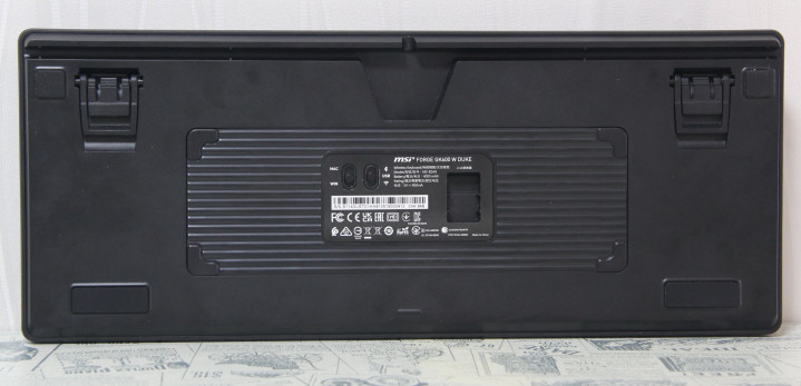 键盘底部设计注重功能性与人体工学的结合,配备4个防滑脚垫和2个两段式可调支撑脚,可分别提供约6°和9°两种倾斜高度,实现共计三种使用角度,满足不同用户的使用偏好。此外,键盘侧面自带一段倾角,数据线采用隐藏式设计并配有三向出线口,方便用户整理走线,保持桌面整洁。出线口的三导向槽设计更是微星的贴心细节,有效避免了线材松动和拉扯损坏的问题。