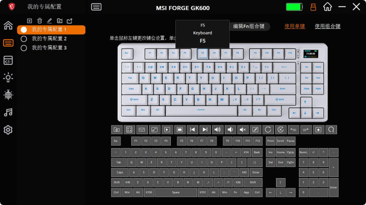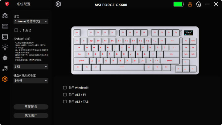 微星GK600W通过安装"MSI FORGE GK600"专属驱动软件,在有线模式下可对键盘进行全面自定义设置。驱动界面简洁直观,左侧为项目栏(按键映射、宏编辑、灯光控制、系统设置),主体为设置面板,即使是新手也能轻松上手,快速找到需要的功能设置。驱动内预置了丰富的选择方案,方便玩家快速选取使用。