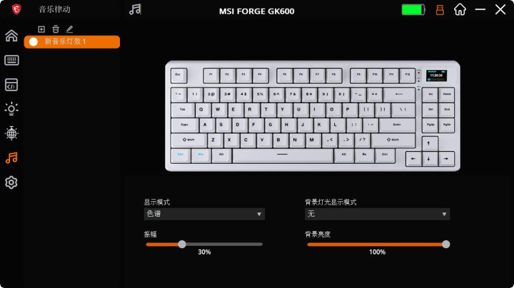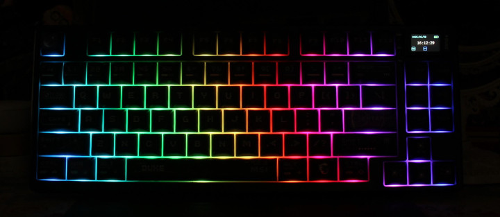 键盘右上角配备了一块1.4英寸的TFT独立小屏幕,开机时会显示微星标志性的龙盾Logo动画,随后可切换为日期、时间、电量、系统状态以及连接模式等实用信息。这块小屏幕是键盘的一大亮点,不仅免去了传统指示灯的繁琐,还为用户提供了个性化的展示空间——通过驱动软件可自定义上传动画LOGO,让键盘成为桌面的视觉焦点。屏幕显示效果清晰细腻,即使在白天自然光下也能保持良好的可读性,但亮度可能略显暗淡,需要通过驱动软件调节亮度以适应不同环境需求。