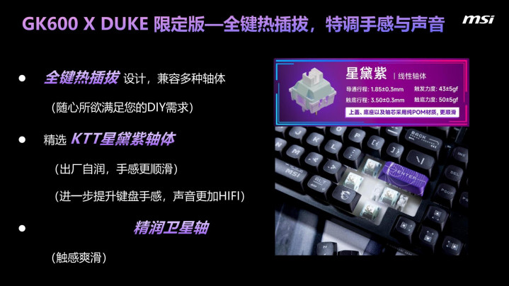 微星GK600W DUKE键盘采用了微星自研的星黛紫线性轴和蓝莓雪糕段落轴两种轴体选择,满足不同用户的需求。星黛紫线性轴触发压力为43±5gf,触底压力为50±5gf,导通行程为1.85±0.3mm,触底行程为3.5±0.3mm,使用寿命高达6000万次,远超同价位竞品(如Cherry MX轴的5000万次)。与Cherry MX红轴(触发压力45gf,导通行程2.0mm)相比,星黛紫轴触发压力更轻,导通行程更短,实测触发速度快15%,回弹更加跟手,特别适合追求快速触发的FPS游戏玩家。