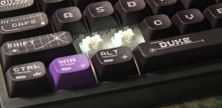 键帽采用五面热升华工艺处理的PBT材质,表面有轻微磨砂触感,既提升了耐用性,又增强了防滑性能。键帽字符采用闭口设计,锐利清晰,热升华工艺渗透深度较深,长期使用不易褪色。这种闭口字符设计不仅美观,还提供了更好的耐用性和抗油性能,相比ABS材质键帽,PBT键帽具有更好的耐磨性和抗油性能,即使长时间使用也能保持良好的外观和手感。微星还附赠了三颗DUKE龙爵风格个性化键帽(用于替换ESC、Windows和Enter键位),这些键帽与普通键帽同为PBT材质,但配色和图案设计更为独特,能够进一步强化键盘的龙爵主题风格。